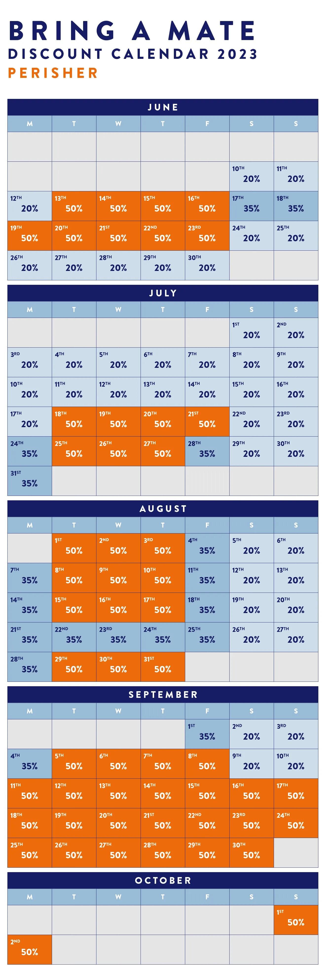 Falls Creek in the peak of winter. Credit: Falls Creek Resort. PERISHER50% off for over half the season, including nearly all days in June and September, plus most Tuesday, Wednesday and Thursdays in August.35% off other select weekdays in July and August20% off for all other days of the season, including July school holidays and August weekends.