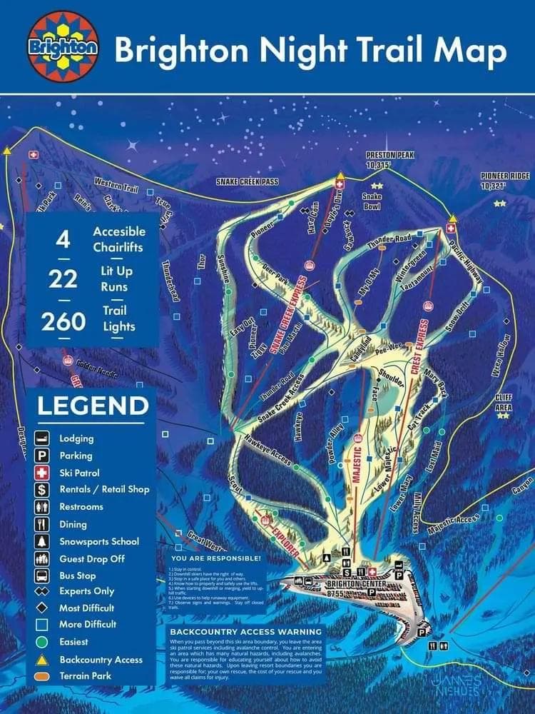 Taking a ride up the Milly Express with the glorious Mt Millcent in the background. Credit: SnowStash While Brighton hasn't released specifics on which Milly trails will be open at night, it's likely they'll start with one or more groomed runs on the right side of the peak. The left side, known for its powder and natural features, probably won't see night skiing action just yet.Skiers and riders can enjoy night runs from 4-9pm, Monday through Saturday, typically from mid-December to late March. Night skiing does come with its own set of challenges, like colder temperatures and reduced visibility, but for many, the chance to spend more time on the snow is worth it. View this post on Instagram A post shared by Brighton Resort (@brightonresort) For Salt Lake City locals finishing work at 4pm or visitors wanting to maximise their ski time, Brighton offers a unique opportunity. While other resorts north of Salt Lake City also offer night skiing, Brighton's easy access from the city makes it a top choice for after-work runs.As Brighton inches closer to potentially claiming the title of 'Largest Night Skiing Terrain' from Mt. Hood Meadows in Oregon, one thing is clear: when the sun goes down, the fun is just beginning at Brighton Resort.