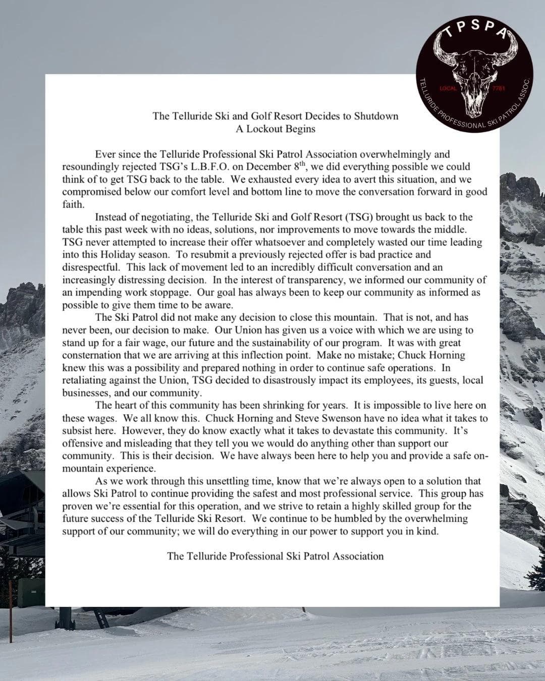 The Telluride Professional Ski Patrol Association is seeking hourly wage increases between 30% and 35%. Management's most recent counteroffer of a 23% hourly increase has been rejected by patrol members, leaving the resort at a standstill.